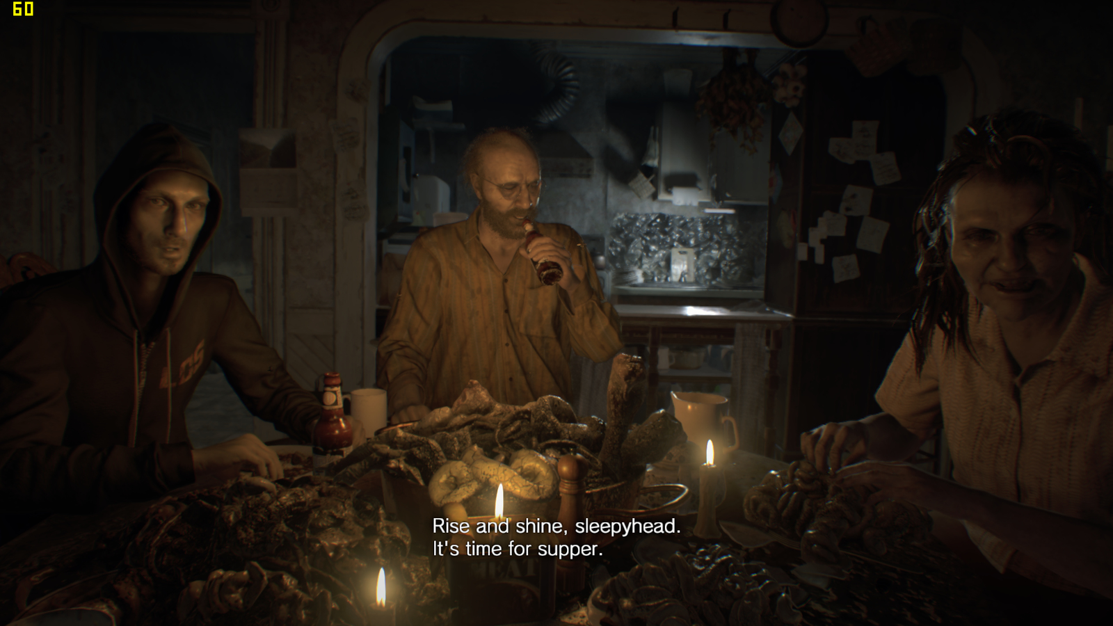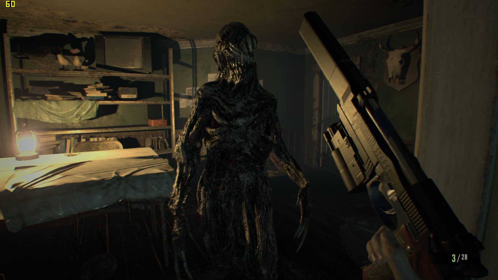 Igen, talán azon kevesek közé tartozom, akik örülnek a Resident Evil 7 mondhatni paradigma váltásán. Ha kicsit jobban körülnézünk a videojáték- és filmiparban, rájövünk, hogy a zombik George A. Romero 1978-as kultfilmje óta elvesztették horrorisztikus ízüket. Akció és szappanopera mellékszereplők lettek, gondolok itt a Walking Dead sorozatra, vagy a Dead Rising videojátékra. De ezek mellett számos olyan filmről és játékról beszélhetünk, ami miatt – csak úgy mint a vámpír legendából – a zombi kultusz is vesztett az erekciójából. Sokan úgy vélekednek, hogy a zombik hiánya miatt sem Resident Evil élmény a hetedik epizód, de úgy gondolom egy sorozatnak joga van megújulni, narratív horizontják kiszélesíteni és valami sokkal hatásosabbat, izgalmasabbat felfedezni, bemutatni. Tovább megyek: nem csak joga van hozzá, hanem szüksége is van rá. Tehát a Resident Evil 7-ben nincsenek zombik, helyettük nagyfogú, fekete, üszkösnyálkás, sétáló dolgok vannak, amik nem félelmetesebbek, mint a zombik, de legalább nem zombik, amiket jól irányzott fejlövésekkel gyorsan le lehet teríteni. Visszatérve: a lerágott fejű, csüngő zombik hiányáért pedig kárpótolnak minket az erős gore jelenetek, az undorító szmötyi, ami tenyészik a ház legkülönbözőbb pontjain.