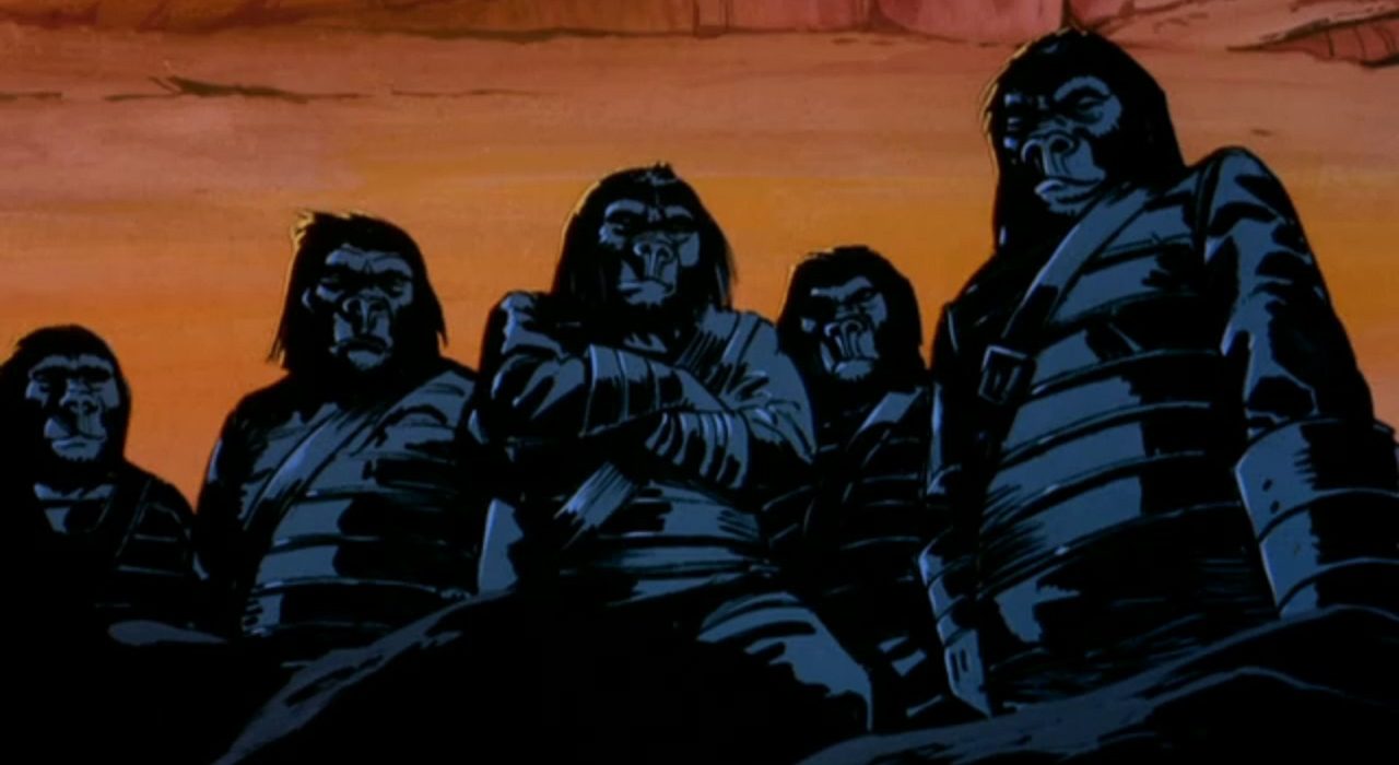 Az 1980-as évek amerikai rajzfilmgyártása sokkal inkább szólt a játékokról, mintsem magukról a rajzfilmekről. Hiszen az igazi profit nem a He-Man and the Masters of the Universe nézettségéből származott, hanem a két rész között reklámozott, ultramenő Castle Greyskull set eladásaiból (a figurák külön kaphatóak!). A Transformers, G.I. Joe vagy Tini Nindzsa Teknőcök sorozatok epizódjai tulajdonképpen az alapul szolgáló akciófigurák 20 perces reklámblokkjai voltak. A Mattel és Hasbro játékgyárak által kitalált tuti üzletből aztán a filmstúdiók sem akartak kimaradni, ám volt egy probléma: a korszak ikonikus filmjei túl erőszakosak voltak a gyerekeknek. Hiába lenne tökéletes akciófigura Robotzsaruból vagy Conanból, ha gyerekek nem ismerik ezeket a karaktereket. A megoldás? Legyen belőlük rajzfilm! Persze nehezen lehetett volna leadni a szombat reggeli műsorsávban, azt, ahogyan Peter Weller testét kegyetlen brutalitással szakítják darabokra a golyók, ennek megfelelően a rajzfilmsorozatok jelentősen infantilizálták az alapanyagot. Így estek meg az olyan anomáliák, mint, hogy Schwarzeneggerrel ellentétben az animált Conan kardja nem fejét szegte az ellenfelének, hanem száműzte őt egy másik dimenzióba! Ezek után, milyen lehet egy, az „apemania” tetőfokán gyártott, csimpánz és orangután figurák eladására kitalált A majmok bolygója rajzfilmsorozat? Nos, egészen meglepő…