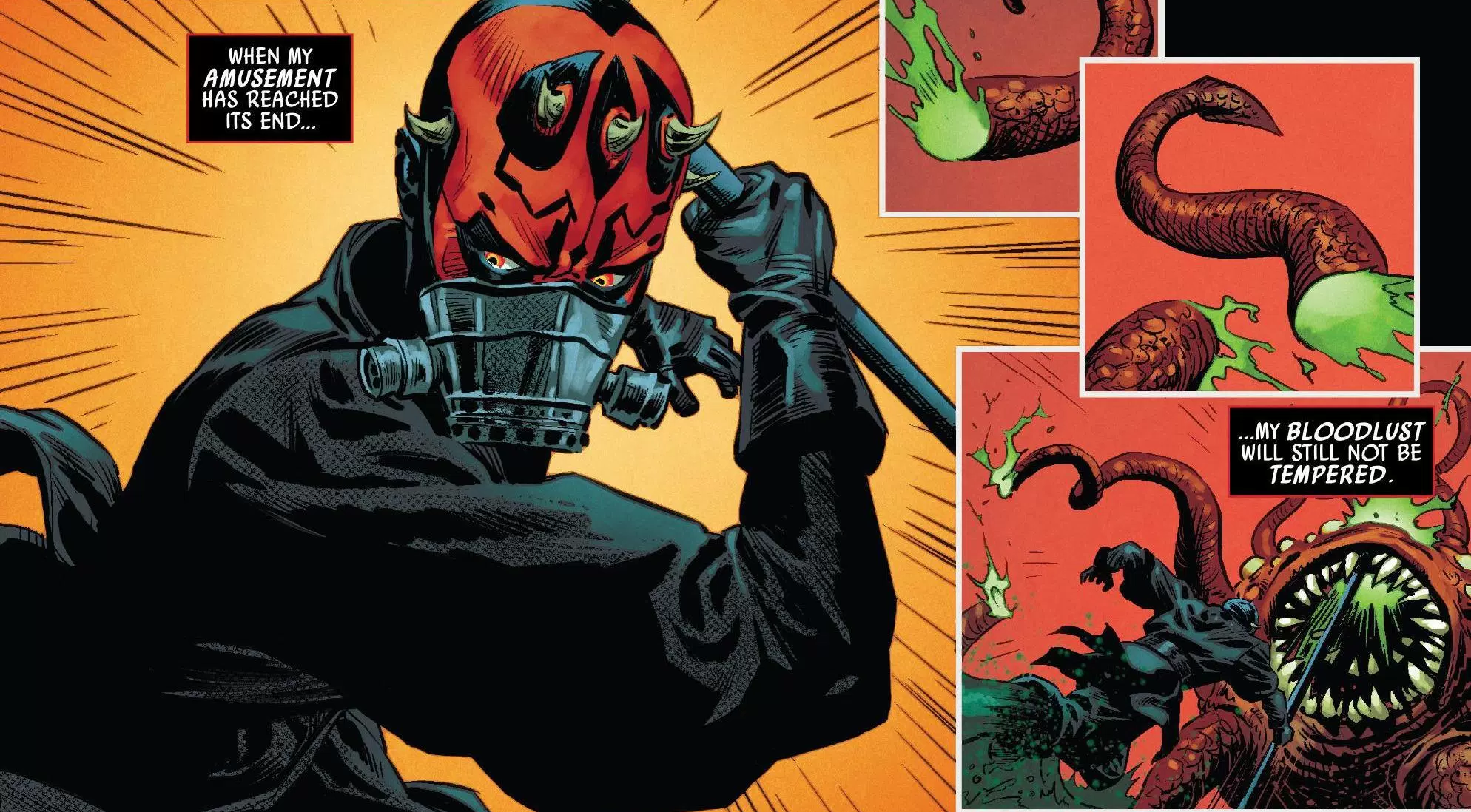 Azt már a Phasma és az Inferno Osztag kapcsán is kifejtetem, hogy én alapvetően nem rajongok azért, amikor a Star Wars gonosztevőiből főhőst csinálnak egy-egy sztori erejéig. Ez az egész mitikus világ két, ellentétes őserő örök harcáról szól, vagyis itt az egyik oldal színtisztán gonosz, a másik pedig mindazt képviseli, amit jónak tartunk. Ha pedig a Saga a Jediknek a Sötét Oldal elleni harcáról szól, és fő üzenete, hogy a Világosságnak végül mindig győznie kell, akkor szerintem nincs értelme a Sith-ek nézőpontjából is bemutatni a dolgokat. Velük nem kell azonosulnunk, nekik nem kell szurkolnunk. Azonban el kell ismernem, hogy ennek a képregénynek az esetében kivételesen tetszett ez a megközelítés. Maul persze itt sem lett komplexebb karakter, szerethetőbb meg pláne nem – és minél jobban bizonygatja, hogy a Jedikkel szembeni bosszúvágya jogos, annál inkább tűnik hamis önigazolásnak a gyűlölet táplálta zavaros filozófiája.