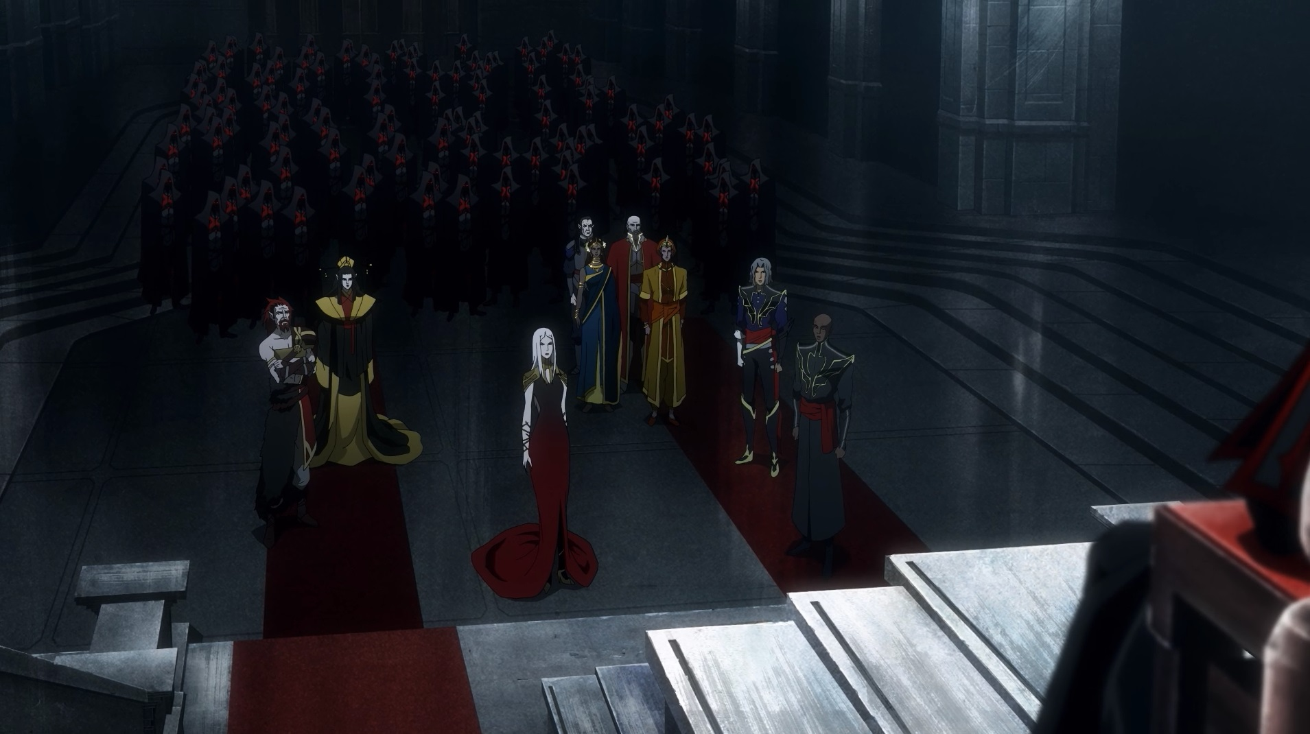 Az első évad esetében rengeteg dolgot akartak négy rövid epizódba beleszuszakolni, ami ugyan eleinte többé-kevésbé működött, ám az utolsó rész eléggé elnagyolt lett: Belmont és Alucard ellenfelekből szövetségesekké válását egy kissé elkapkodták. Ezzel szemben az új szériában tökéletesen kihasználják a játékidőt. Most szépen lassan halad előre a cselekmény, hiszen nem kell kapkodni, nem kell gyakran előre ugrani az időben. Ráadásul a karakterek egy-két mondatos bemutatása helyett ezúttal rengeteg flashbacket kapunk – igaz, emiatt az a faramuci helyzet állt elő, hogy a Draculának dolgozó vámpírok és emberek életéről többet tudunk, mint a főhősökéről. Ugyanakkor ez csak azt a célt szolgálja, hogy a hősökkel szemben felvonuló karakterek kapjanak egy mélységet, semmi esetre sem jelenti a Jó és a Rossz közötti határ elmosását. Itt nincsenek morális szürkezónák, mert miközben megindokolja a negatív karakterek tetteit, arra is rámutat, hogy a motivációjuk aljas. Csak egyetlen kakukktojás, egyetlen ambivalens figura van, Dracula egyik emberi segítője, Hector, aki végső soron naivitása miatt kerül a vámpír udvarába, majd az ott kialakuló hatalmi harc közepébe – ám a végén őt is olyan helyzetbe hozzák, hogy az azt követő cselekedetei alapján a következő évadban valószínűleg már besorolható lesz a jók vagy rosszak közé.