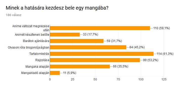 Egy-egy mangába a legtöbben a tartalomleírás alapján kezdenek bele; ez a kitöltők 61,3% -át jelenti. Őket követik azok az olvasók, akik – például a könyvolvasókkal ellentétben, akik a kiinduló alappal, azaz a könyvvel kezdik a történettel való ismerkedést – a filmes adaptáció, vagyis az anime után kezdenek bele az alapműbe. További nagy befolyásolási faktorok a manga rajzstílusa (53,2%), újságban vagy blogon megjelent ajánló (45,2%) és a mangaka, azaz ki rajzolta a történetet (35,5%).