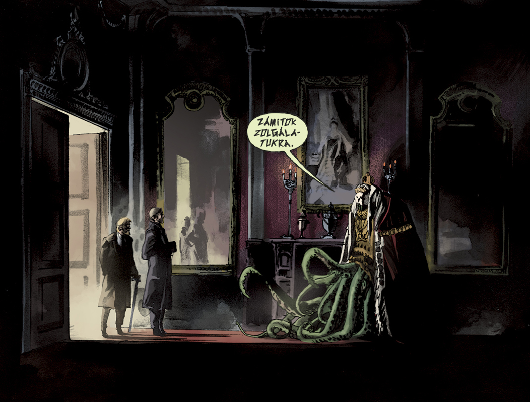 Míg Gaiman írása egy Holmes-imitációként kezdi, és csak később lep meg minket a lovecrafti fordulattal (azt is fokozatosan), addig Albuquerque a legelső oldaltól jelzi képi világával, hogy ez nem egy sima Sherlock Holmes adaptáció lesz.