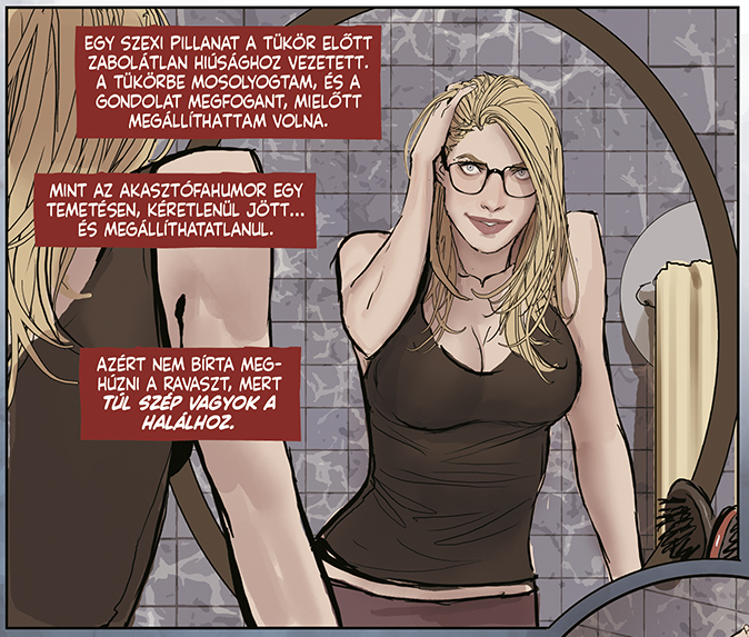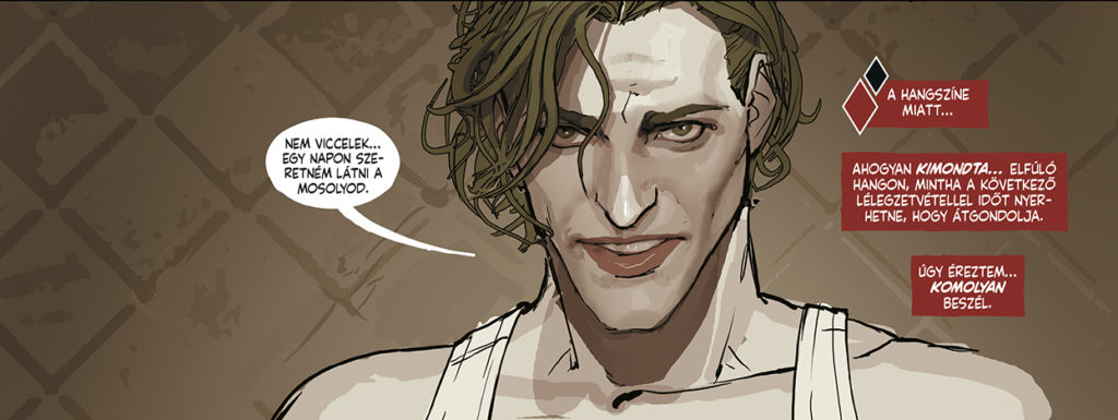 Persze a képregény pont attól olyan nagyszerű, hogy ezt nem ilyen egyszerűen zavarja le. A szerző szívbemarkoló aprólékossággal járatja végig karakterével ezt az utat és mutatja be nekünk, menyire is nem boldogul egyszerűen egy ilyen személyiség az érzelmeivel. Láthatjuk, ahogy először alkoholizmusba taszítja magát, majd fokozatosan enged a zavart álmai és az Arkhamban szociopaták között töltött egyre több idő nyomásának. A doktornő egyre beszűkülő figyelmét jól kiemeli a cselekmény, ugyanis rengeteg figyelmeztetést kap az Arkham dolgozóitól. Sőt, a biztonsági szolgálat vezetője látszólag komolyabban meg is kedveli őt, de Harleen már szinte észre sem veszi a férfi közeledését, nyitási kísérleteit. Akkor már csak Joker „meggyógyítása” érdekli.