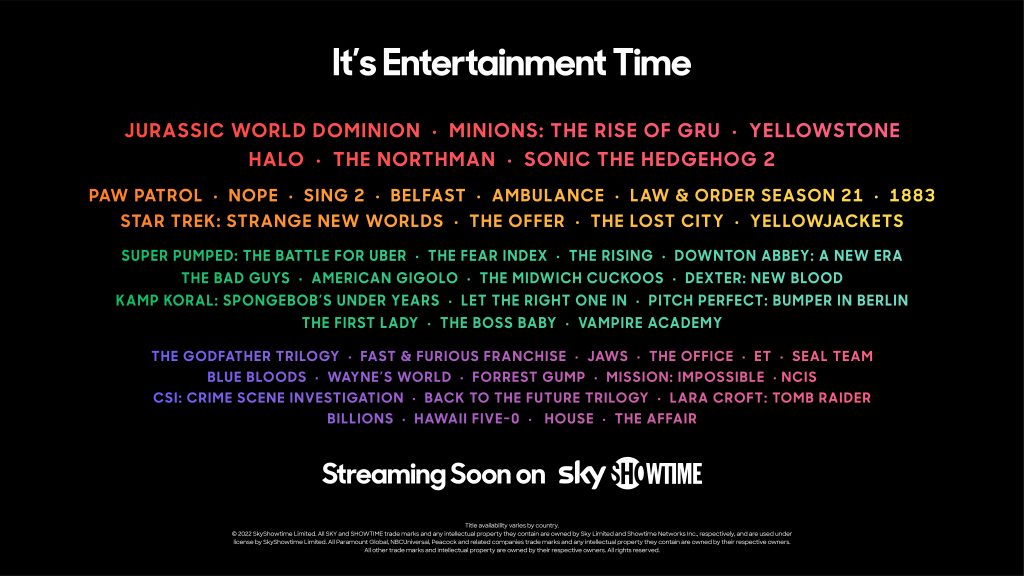 A kínálat között a Paramount Pictures és a Universal Pictures alkotásai szerepelnek majd, mint például a Top Gun: Maverick, a Jurassic World Világuralom, a Minyonok: Gru színre lép, Az Északi, az Énekelj! 2., a Sonic a sündisznó 2., Az elveszett város, a Downton Abbey: Egy új korszak, a Nem, a Belfast, a Rohammentő vagy A rosszfiúk. Ezen túl a Nickelodeon, a DreamWorks Animation, a már említetrt Paramount+, a Showtime, a Sky Studios és a Peacock felhozatala is érkezik, műfajok széles skáláját fedve le. Itt lesz látható a Stra Trek: Strange New Worlds, a Yellowjackets vagy a Dexter: New Blood.