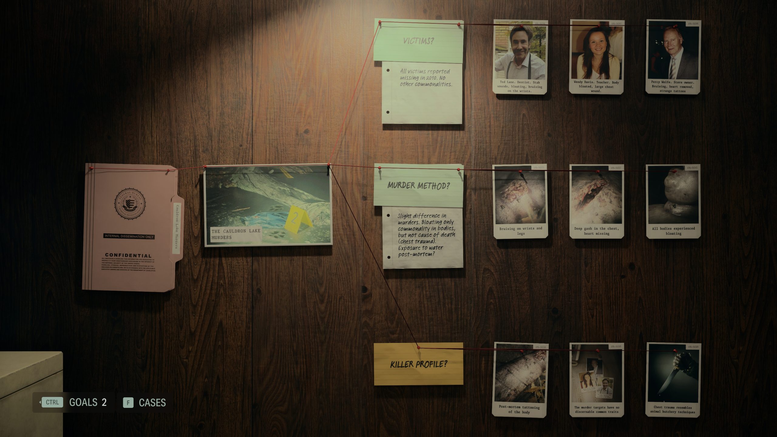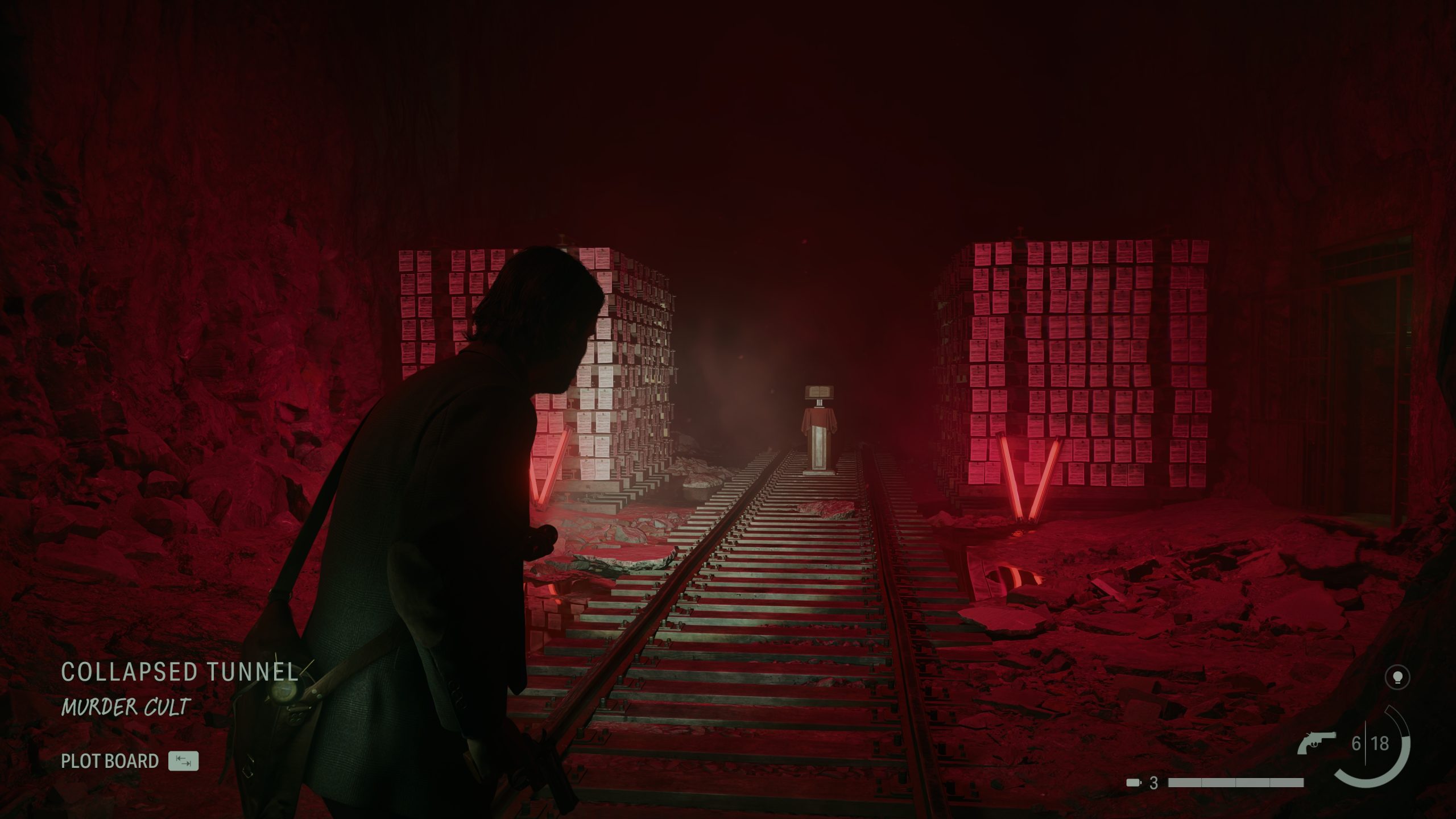 A harc mellett mindként szálon egyedi feladataink is lesznek. Sagával – ahogy azt írtam – nyomoznunk kell. Meg kell vizsgálnunk helyszíneket, tárgyakat, majd összegeznünk kell azt, amit találtunk. Ilyenkor ő visszavonul az elméjébe, ami egy szobaként manifesztálódott, itt pakoljuk felfelé a postitekre, cetlikre, fényképekre felírt nyomokat. Itt összegzi a karakter azt, amit a történet adott pontján nyomként megtalált és megértett az ügyből: a szektáról, Wake eltűnéséről. Kiválóan illeszkedik ez a narratívába, szerves részét képezi annak, hogy Sagával együtt próbáljuk megfejteni azt, hogy mi is történik Bright Fallsban. A történetvezetés szerves részeként így ad újabb részleteket a paranormálishoz a játék, jelentősen kibővítve azt, amit az első részben Alan Wake-től.