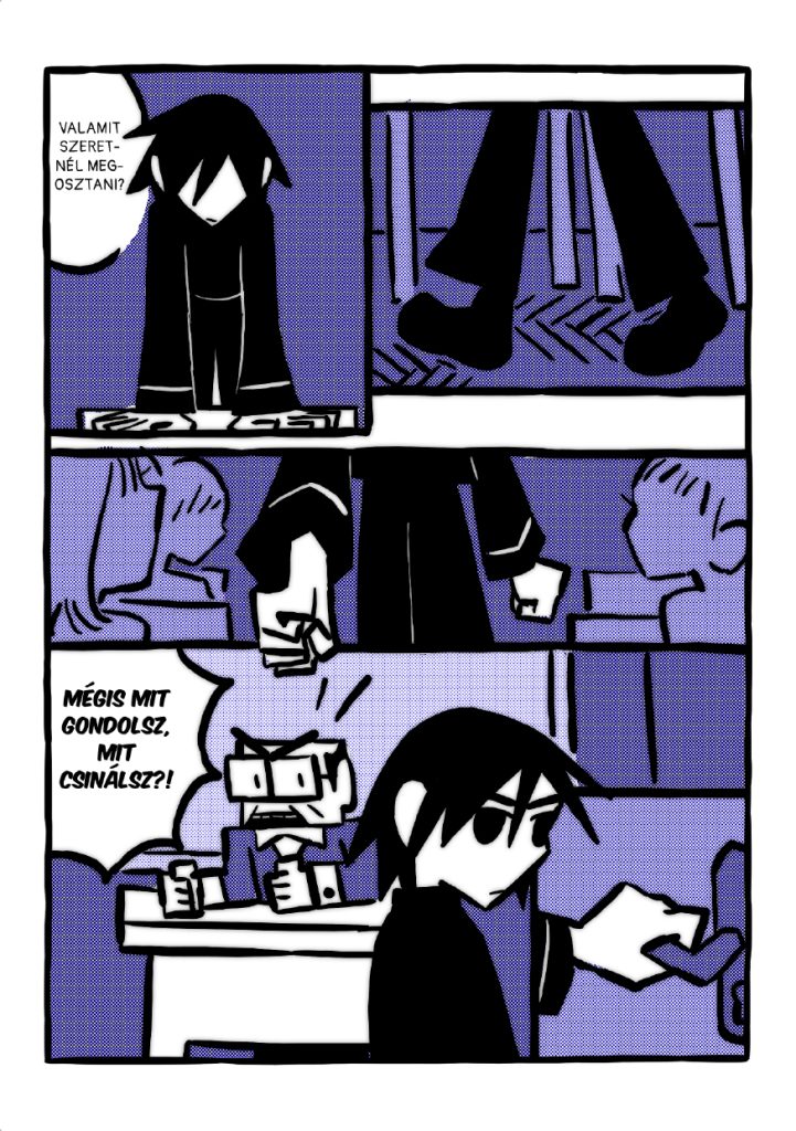 Látszik rajta, hogy alkotója érti a képregények formanyelvét és hatásmechanizmusait. A mangákra hajazó fekete-fehér világot a lila különböző árnyalataival dobja fel, így lesznek igazán különlegesek az illusztrációk. A legjobb azonban az, ahogyan az elnagyolt, egy-két húzásból megalkotott figurákat megálmodja. Egyrészt kiválóan érzékelhetőek a szereplők mozgásai, másrészt az érzéseik is parádésan látszanak a kockákon.