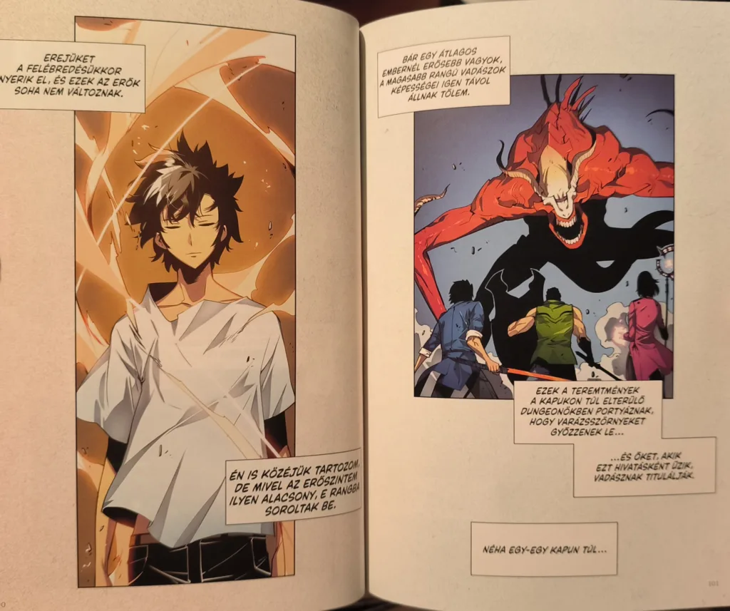 A webképregények nem véletlen olyan népszerűek. A függőleges elrendezésnek köszönhetően gyorsan görgethetőek és többségében nagyon szépek, színesek és izgalmasak. Amint átültetik ezeket nyomtatott formába, akkor is ugyanolyan minőségben képesek megjelenni, mint a képernyőn. A mangákkal ellentétben ezeket nem jobbról balra kell olvasni, hanem balról jobbra haladva. Így van ez a Solo Leveling esetében is, amely egy csodás kiadvány lett. Ráadásul a manhwa végig színes, ami még izgalmasabbá és élvezetesebbé teszi a rajzot, a papír is kellően vastag, jól lapozható a kötet. A sötét és a világos alap pont akkor váltja egymást amikor kell, és egyáltalán nem zavaró módon. A szöveg tökéletesen olvasható mindenhol, és Holló-Vaskó Péter fordítása is remek lett. Pont azokat a kifejezéseket hagyta meg a történetben, amelyek erősítik a videójátékos jellegét a Solo Levelingnek. Emellett Sung pechsorozata és ahogy vélekedik magáról sokszor humorosan van ábrázolva, amely kellően oldja a hangulatot és szimpatkusabbá teszi őt. Röviden tehát minden megvan a kötetben, amit egy képregénykedvelő vagy mangarajongó elvárhat egy minőségi kiadványtól.
