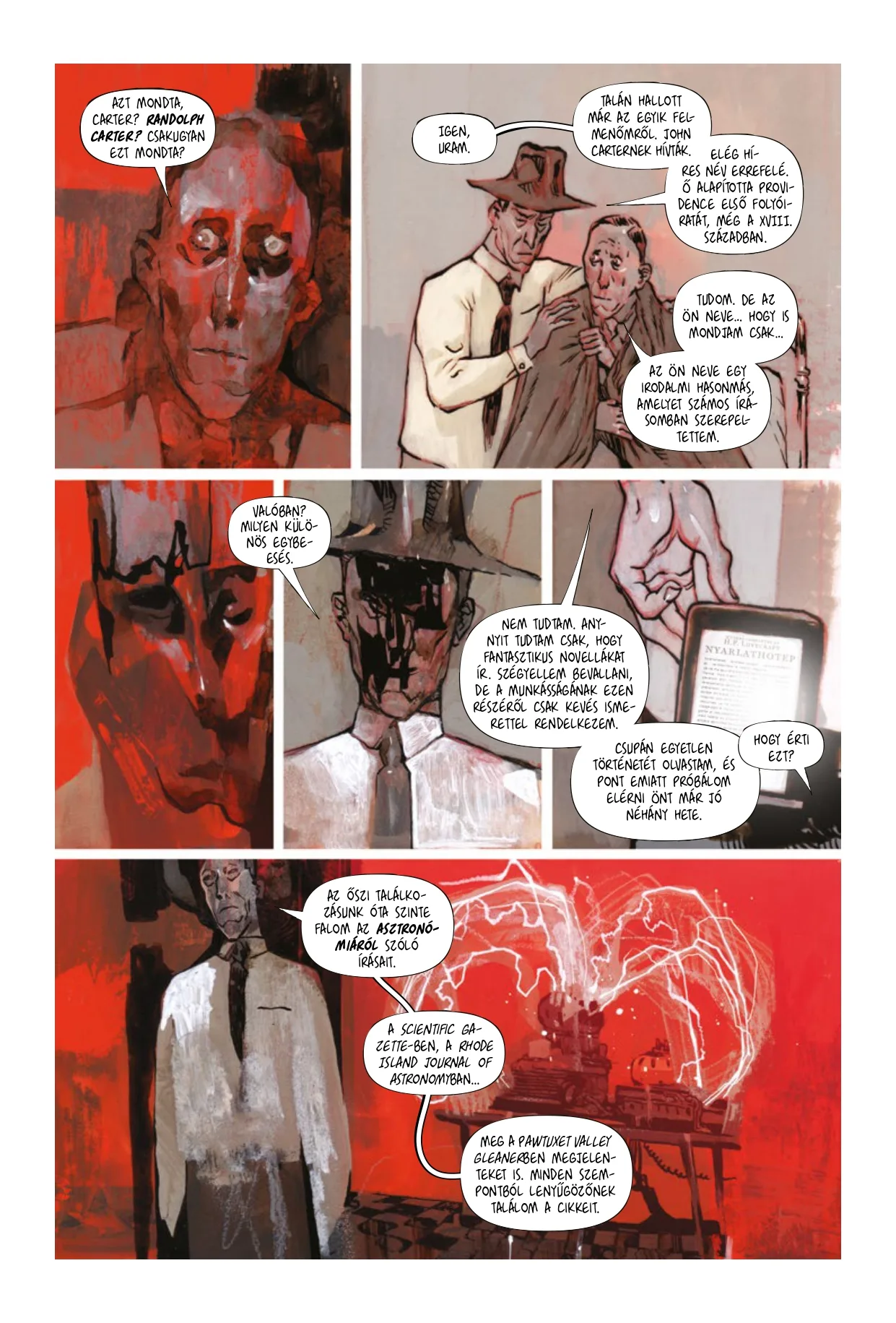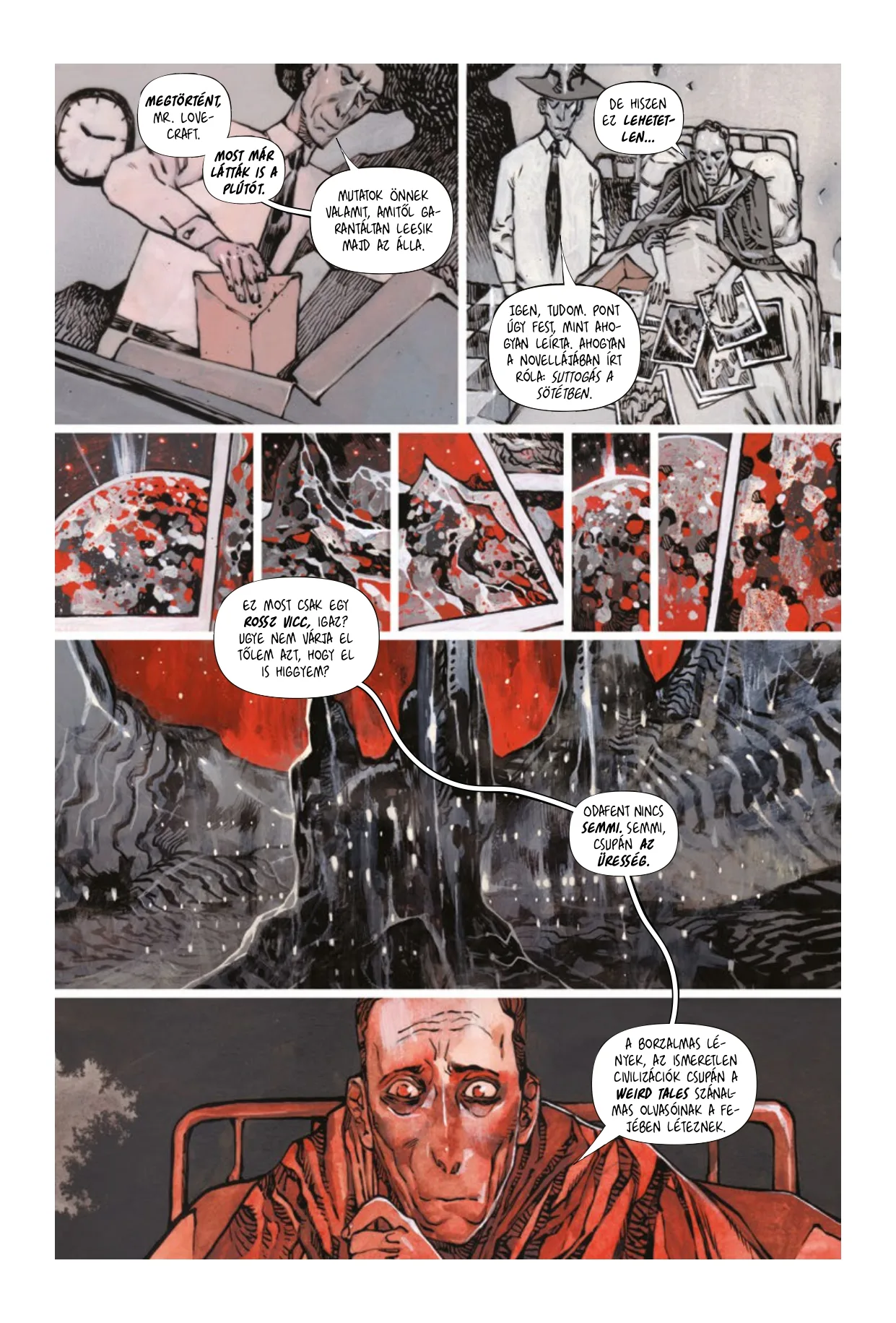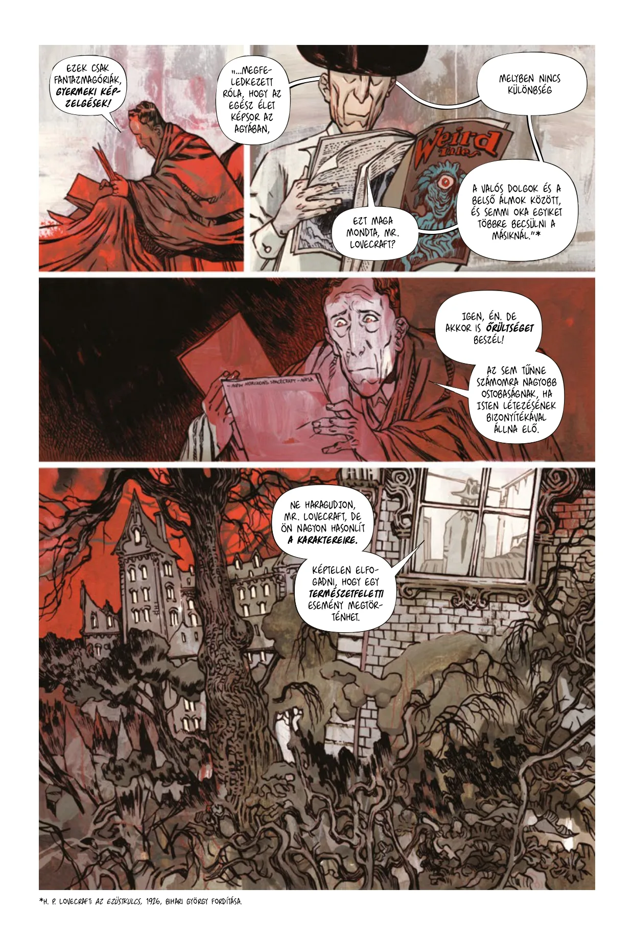Utóbbinak novellát is írt Lovecraft, a világhírű bűvész pedig a szerzőt delíriumos haláltúráján kísérgeti. Mintha Dante és Vergilius az Isteni színjátékban szereplő párosának egy morbidabb, gúnyosabb verziójával szembesülnénk, ahol a pokol valójában Lovecraft tudata, bugyrai pedig a különböző kapcsolatok, amelyek nem teljesedtek be vagy megkeseredtek az évek során. Ahogy az életben is próbált a híres szabadulóművész segíteni munkalehetőségekkel és kapcsolatokkal, úgy a Howard Phillips Lovecraft utolsó napjában kísérli meg átvezetni őt elméje bugyrain. Szeretné, ha felfogná valóságát, és szembesülne múltjával – illetve megalkotná új jövőjét. Már-már furcsa, egyszerre futurisztikus és mitikus totemlényekként bukkan fel Neil Gaiman, Stephen King és Warren Ellis, akik elköteleződnek amellett, hogy őrizni fogják Lovecraft hagyatékát. Erre valószínűleg szüksége is lett volna életében, ugyanis folyamatosan küszködött. Ahogy S.T. Joshi, önéletrajzának írója fogalmazott: „miközben haldoklott […] elképzelte a végső feledésbe merülést, amely felülkerekedik művein.” Ez a gondolat egyébként valamennyire tételmondata is lehetne a képregénynek, egyfelől megtestesítve ezt az érzést, másfelől tanúskodva a készítők elköteleződéséről és odaadásáról. Minden képkocka, minden megnyilvánulás, minden fel-felbukkanó alak okkal szerepel, és kapcsolódik Lovecraft életéhez, halálához és hagyatékához. A maga módján életben maradt a halál után – hiába nem vágyott erre, és hiába csábítgatta az édes megsemmisülés.