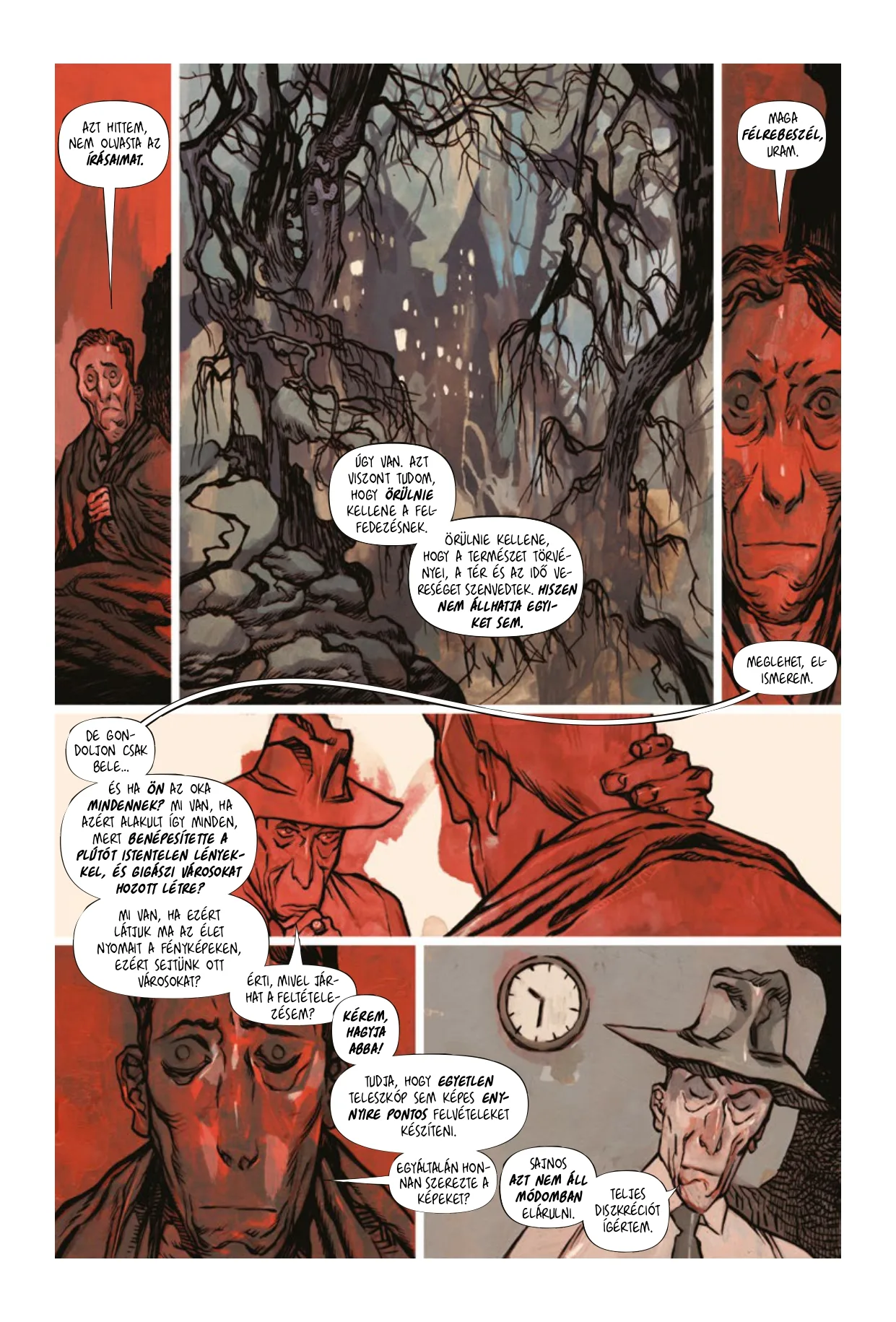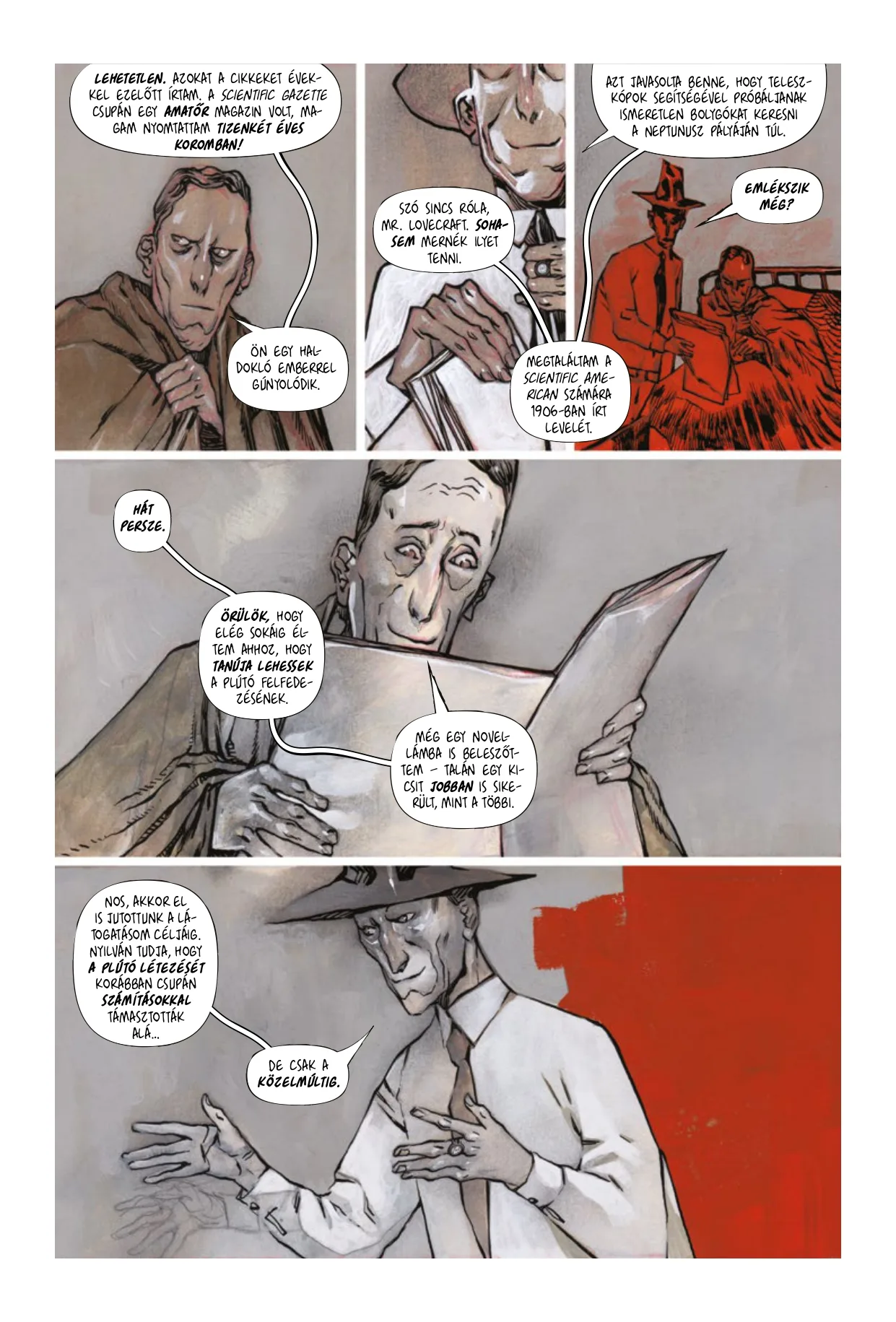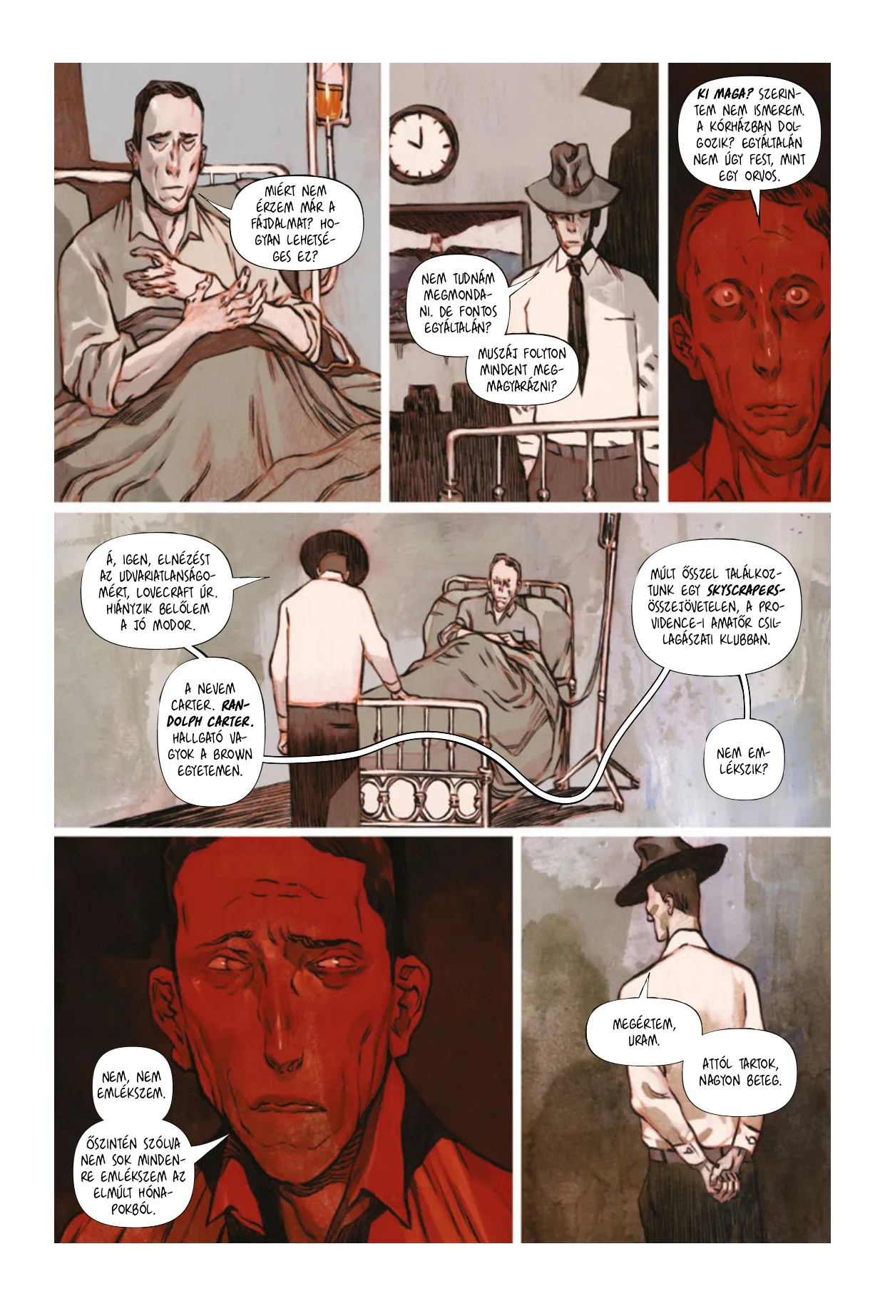 Utóbbinak novellát is írt Lovecraft, a világhírű bűvész pedig a szerzőt delíriumos haláltúráján kísérgeti. Mintha Dante és Vergilius az Isteni színjátékban szereplő párosának egy morbidabb, gúnyosabb verziójával szembesülnénk, ahol a pokol valójában Lovecraft tudata, bugyrai pedig a különböző kapcsolatok, amelyek nem teljesedtek be vagy megkeseredtek az évek során. Ahogy az életben is próbált a híres szabadulóművész segíteni munkalehetőségekkel és kapcsolatokkal, úgy a Howard Phillips Lovecraft utolsó napjában kísérli meg átvezetni őt elméje bugyrain. Szeretné, ha felfogná valóságát, és szembesülne múltjával – illetve megalkotná új jövőjét. Már-már furcsa, egyszerre futurisztikus és mitikus totemlényekként bukkan fel Neil Gaiman, Stephen King és Warren Ellis, akik elköteleződnek amellett, hogy őrizni fogják Lovecraft hagyatékát. Erre valószínűleg szüksége is lett volna életében, ugyanis folyamatosan küszködött. Ahogy S.T. Joshi, önéletrajzának írója fogalmazott: „miközben haldoklott […] elképzelte a végső feledésbe merülést, amely felülkerekedik művein.” Ez a gondolat egyébként valamennyire tételmondata is lehetne a képregénynek, egyfelől megtestesítve ezt az érzést, másfelől tanúskodva a készítők elköteleződéséről és odaadásáról. Minden képkocka, minden megnyilvánulás, minden fel-felbukkanó alak okkal szerepel, és kapcsolódik Lovecraft életéhez, halálához és hagyatékához. A maga módján életben maradt a halál után – hiába nem vágyott erre, és hiába csábítgatta az édes megsemmisülés.