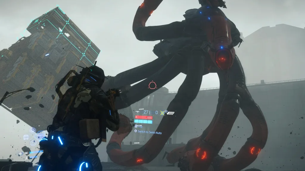 Ilyenkor jöhet képbe Dollman, aki végig velünk van az úton, beszélget Sammel és segíti a játékost, ugyanis őt bizony el lehet dobni. Olyan ő, mint egy felderítő drón: elhajítjuk, majd a hozzá kapcsolt zsinór segítségével, mint egy jojót, visszahúzzuk. Ezzel kapcsolatban viszont érdemes megjegyezni, hogy számomra kicsikét nehéz volt kontrollerrel célozni, ugyanis nincs olyan magas szintű célzás-rásegítés, mint például az éppen aktuális Call of Dutyban.