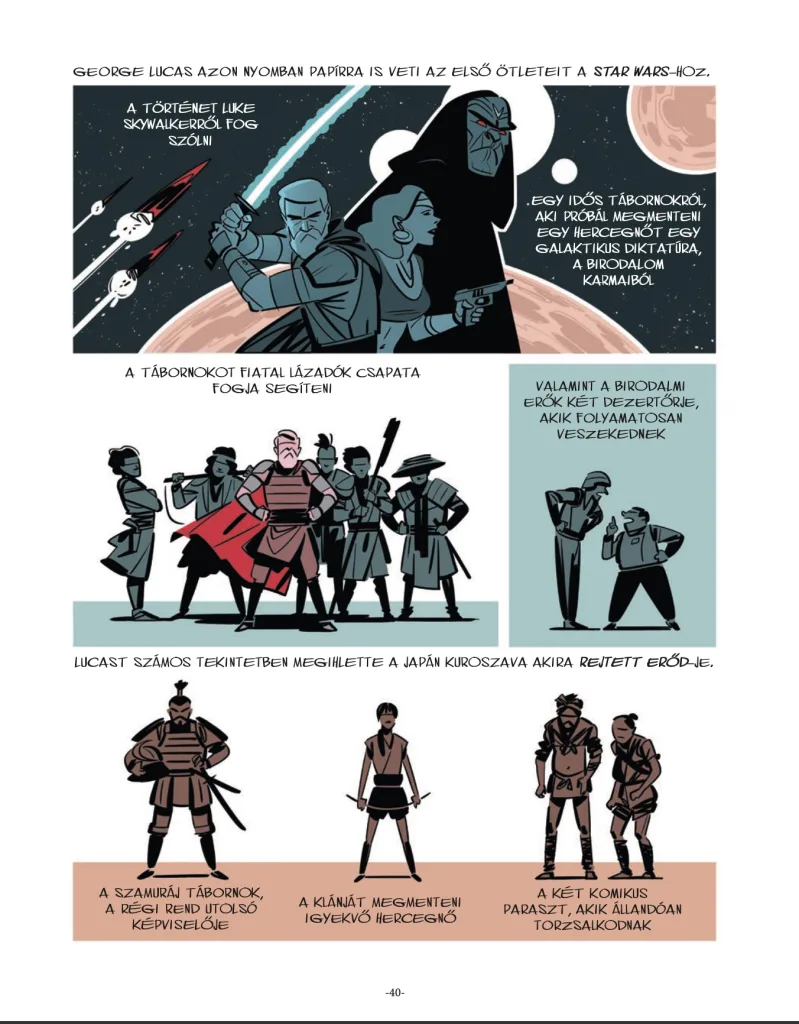 Ezekhez pedig tökéletesen passzolnak Renaud Roche rajzai, aki szintén egyszerűen, de kifejezően vetette papírra a karaktereket és a helyszíneket. Kifejezetten kreatívan alkalmazta a színeket, leginkább az egyedi vagy képzeletbeli jeleneteknél, kontrasztba állítva a valóság szürkeségét azzal a grandiózus, varázslatos világgal, amit Lucas megálmodott. A képregény egyébként tökéletes kísérője a Francis Ford Coppolára fókuszáló Út a paradicsomba című könyvnek, ugyanis bizonyos szakaszoknál van némi átfedés a sztorik között. Talán a Lucas háborúi kevésbé kritikus alkotójával, de ez jellegéből is fakad: kevésbé merül el a részletekben, és inkább a fontosabb mérföldkövekre összpontosít.