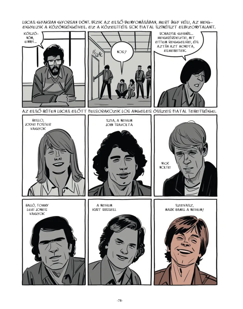 Az alkotást lapozgatva azon kaptam magam, hogy – főleg a film megvalósítása felé haladva megvalósítása –, kifejezetten izgultam a szereplőkért. A készítők kiválóan ragadták meg azt a ritmust és azokat a karakterjegyeket, amik együttesének köszönhetően igazán együtt érezhetünk a szereplőkkel, hiába tudjuk, hogy a sztori vége minden idők egyik legelismertebb és legsikeresebb alkotása, ami új filmes fogalmakat és technológiákat teremtett. Izgultam, nevettem, meghatódtam, ahogy hőseinket szorítják a határidők, szivatják a pénzes fejesek, belső konfliktusok alakulnak ki közöttük. Ahogy Lucas stresszelve hajtincseket vagdos. Ahogy Ford és Fisher között munkahelyi románc alakul ki (amiről mesél Carrie Fisher A hercegnő naplója c. könyvében is). Ahogy az Obi-Wan Kenobit alakító Alec Guinness ki akar szállni félúton. Ahogy Tunéziában kiégnek a droidok. Ahogy – legalább őszinte – barátai és stábja sem látja azt a víziót, amit Lucas elképzelt. És ahogy a cukorbeteg alkotó az összeomlás szélére kerül. Hopman és Roche nagyon ügyesen ragadták ki a fontos, mégis informatív mozzanatokat, hogy a sikersztori klasszikus lendületét ötvözzék egy dokumentarista stílussal. Ráadásul ez újabb bizonyítéka annak, hogy a képregények, még ha talán nem is annyira precízek,